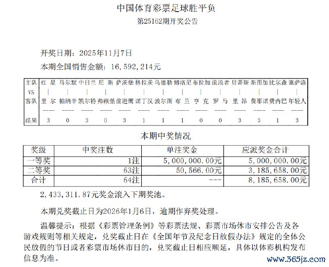 北京时分11月7日,赢输彩第25162期罢了了一起14场比赛的争夺。14场1等开出1注,单注奖金500万元,另有243万元滚存至第25163期竞猜;14场2等开63注,单注奖金50566元。任九开出547注,单注奖金19413元。本期14场销量为16,592,214元,任九投注总数为16,592,490元。